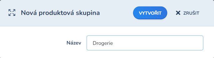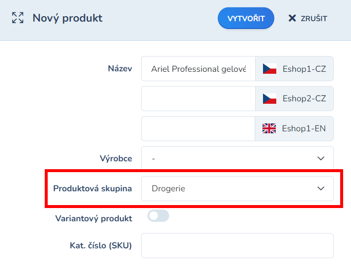 Produktová skupina je povinnou položkou při vytváření nového produktu.