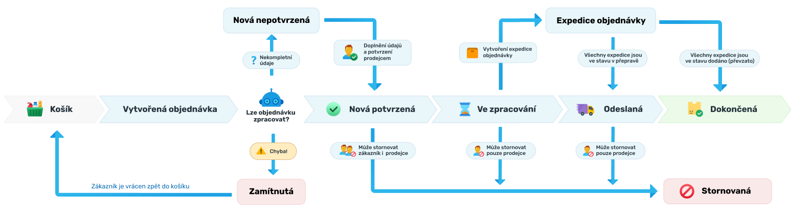 Proces zpracování objednávky a jeho jednotlivé fáze nelze měnit, jedná se o systémový workflow. K přizpůsobení procesu zpracování slouží uživatelské stavy objednávek.