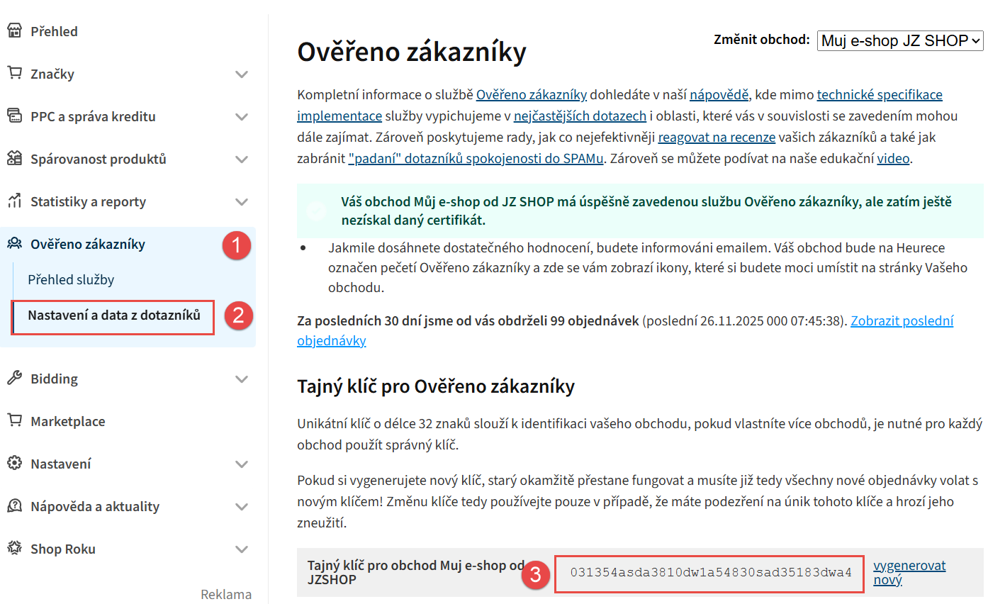 Používá se pro službu Ověřeno zákazníky. Tajný klíč najdete v sekci Ověřeno zákazníky -> Nastavení a data z dotazníků na adrese https://sluzby.heureka.cz/n/sluzby/certifikat-spokojenosti/ po přihlášení do vašeho účtu.