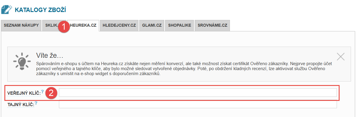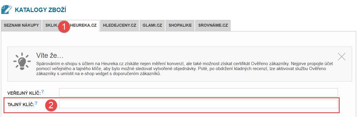 Aktivaci konverzních kódu provedete vložením veřejného klíče a tajného klíče do administrace e-shopu v sekci Nastavení -> Zbožové srovnávače -> Heuréka.cz.