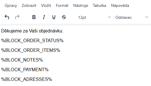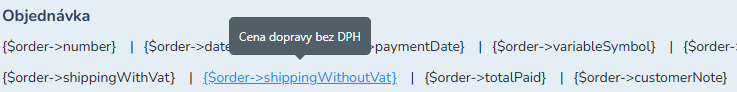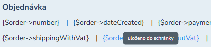 ☝️ Příklad použití proměnné {$order->number} v HTML obsahu